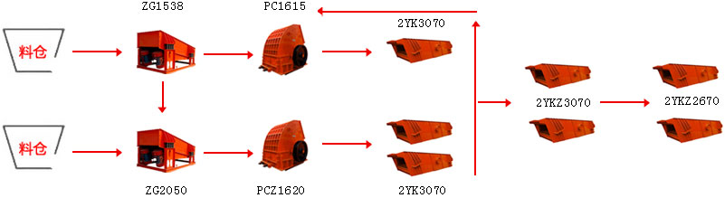 鼎力重型錘式破碎機(jī)PCZ1512+PCZ1308+鼎力振動(dòng)給料機(jī)ZG1238*1臺(tái)+鼎力圓振動(dòng)篩3YK2460*2臺(tái)、2YK2460*2臺(tái)